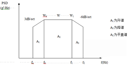 為了簡便起見,往往將功率譜密度曲線圖劃分成若干矩形和三角形,并利用上升斜率(如3dB/oct)和下降斜率(如-6dB/oct)分別算出wa 和w2,然后求各個幾何形狀的面積與面積和,再開方求出加速度總均方根值。