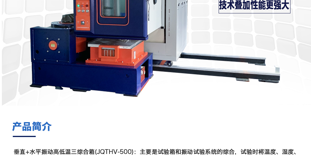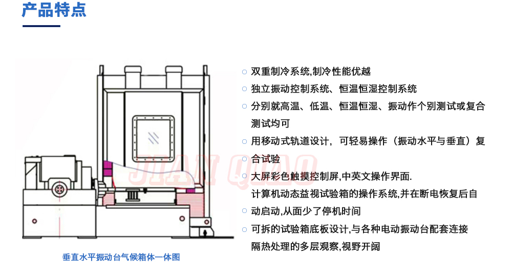 用途:垂直+水平振動(dòng)高低溫三綜合箱(JQTHV-500):主要是試驗(yàn)箱和振動(dòng)試驗(yàn)系統(tǒng)的綜合,試驗(yàn)時(shí)將溫度、濕度、振動(dòng)(高溫或低溫),(正弦振動(dòng)或隨機(jī)振動(dòng))以及電應(yīng)力按規(guī)定的周期綜合在同一氣候試驗(yàn)箱中施加到樣品上進(jìn)行溫度、濕度、振動(dòng)的“環(huán)境仿真”試驗(yàn)。
